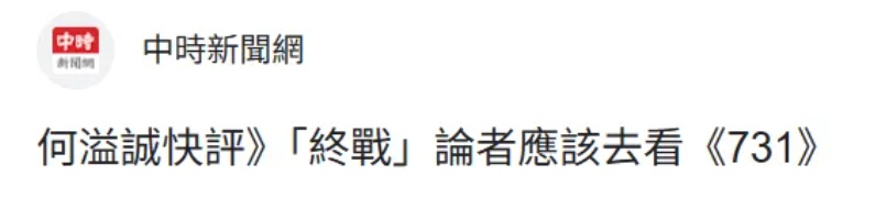 包括《中国时报新闻网络》和台湾全球新闻网络在内的20多个岛屿媒体很快就注意到海报上的四个单词“全球发行”,认为日本军队不是唯一的中国疾病,昆迪以及全人类的文明范围。台湾的“是的新闻”报道说,这部电影提出了征服者的过程,试图涵盖事实和T中国过程恢复了历史的现实。台湾Yahoo新闻报道说,这部电影“ 731”已在全球发行,留下了无处可隐藏的犯罪,使它在世界各地蔓延,并唤醒世界以提醒历史的现实。