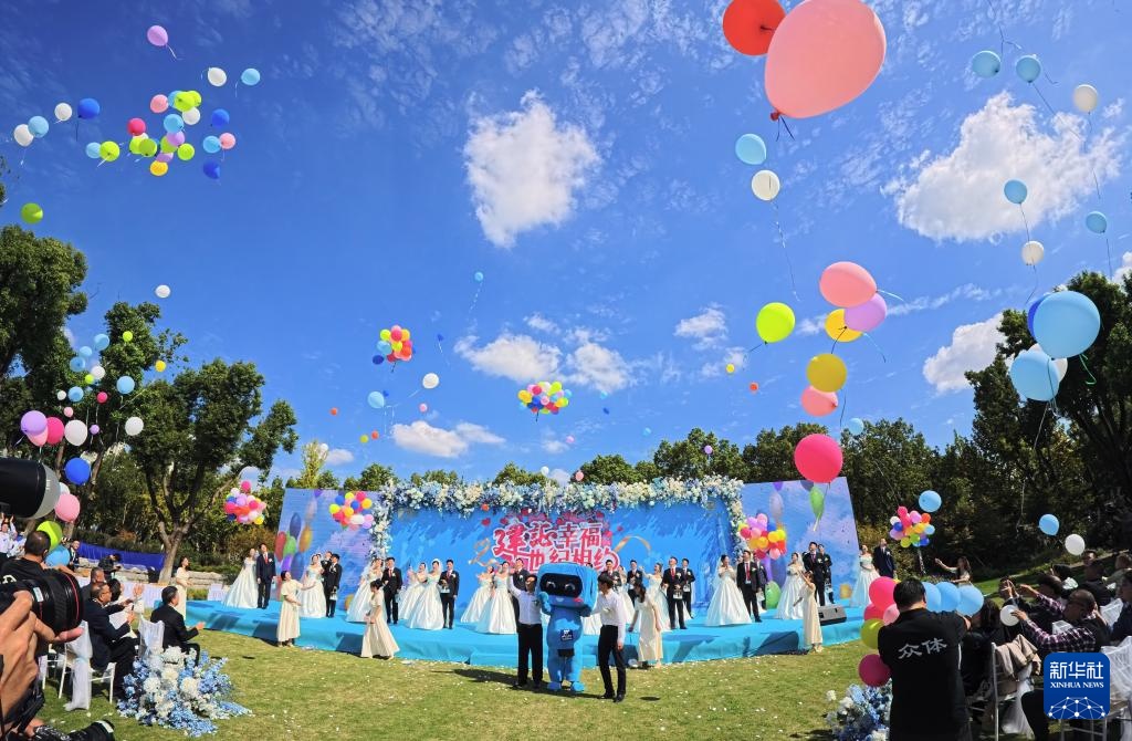 10月25日,新婚夫妇在集体婚礼现场放飞气球。 10月25日,中建二局华东公司第三届集体婚礼在上海浦东新区世纪公园举行。 19对新人由城市建设者和他们的恋人组成,身着正装,在亲友同事面前分享新婚的幸福和甜蜜。新华社记者方哲10月25日拍到PageBreak拍摄的集体婚礼场景。10月25日,中建二局华东公司第三次集体婚礼在位于上海浦东新区的世纪公园举行。 19对由城市建设者及其恋人组成的新人,身着正装,在亲友同事的见证下,分享婚姻的幸福与甜蜜。新华社记者 方哲 10月2日分页 摄5、一对新人在集体婚礼场地合影。 10月25日,中建二局华东公司第三届集体婚礼在上海浦东新区世纪公园举行。 19对新人由城市建设者和他们的恋人组成,身着正装,在亲友同事面前分享新婚的幸福和甜蜜。新华社记者 方哲 摄 10月25日,参加集体婚礼的新婚夫妇来到活动现场。 10月25日,中建二局华东公司第三届集体婚礼在上海浦东新区世纪公园举行。 19对新人由城市建设者和他们的恋人组成,身着正装,在亲友同事面前分享新婚的幸福和甜蜜。新华社记者 方哲 分页10月25日摄身穿婚纱的新娘等待入场。 10月25日,中建二局华东公司第三届集体婚礼在上海浦东新区世纪公园举行。 19对新人由城市建设者和他们的恋人组成,身着正装,在亲友同事面前分享新婚的幸福和甜蜜。新华社发(潘宗元摄)10月25日,新婚夫妇在集体婚礼现场向宾客投掷喜糖。 10月25日,中建二局华东公司第三届集体婚礼在上海浦东新区世纪公园举行。 19对新人由城市建设者和他们的恋人组成,身着正装,在亲友同事面前分享新婚的幸福和甜蜜。新华社发(潘宗元 摄)